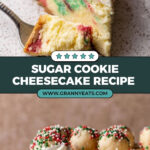 This Sugar Cookie Cheesecake combines the buttery crunch of a sugar cookie crust with a creamy vanilla cheesecake studded with festive cookie dough balls. Topped with a luscious white chocolate ganache and sprinkled with colorful Christmas jimmies, it’s the perfect holiday dessert to impress family and friends.