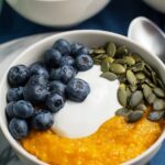 - Assemble the Bowls: Divide the fluffy sweet potato mixture evenly into 4 bowls. Top each bowl with fresh blueberries, pumpkin seeds, and a dollop of plain Greek yogurt for added flavor, crunch, and creaminess.