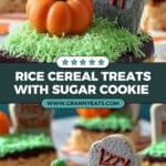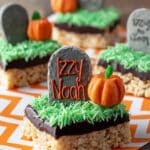 Freezing fully assembled Tombstone Treats isn’t my favorite because the textures can change — especially the frosting and coconut. However, you can freeze the cereal base and the cookies separately before assembling, wrapped tightly in plastic wrap and foil, then thaw them completely before decorating and putting together.