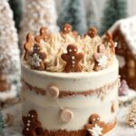 12. Final frosting and decoration: Remove the chilled cake and apply a thicker, final coat of buttercream. Smooth the sides with a cake scraper for a professional finish. Pipe a swirl of white buttercream around the cake’s top edge using a star tip. Use the brown cocoa buttercream to pipe gingerbread men around the sides, adding white details with the smaller piping bag. Finish by crumbling gingerbread biscuits on top.