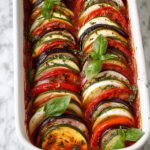 - Arrange Vegetables: Alternate stacking and placing the veggie slices (onion, zucchini, eggplant, tomato) vertically and tightly in rows on their side against the edge of the baking dish to form a visually appealing pattern until the pan is filled and all slices are used.